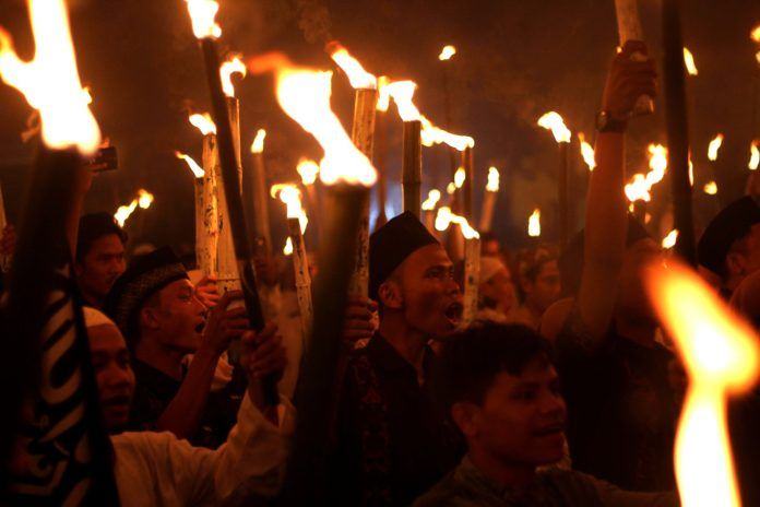 Ribuan masyarakat baik dari dalam maupun luar Kota Medan ikut dalam pawai obor.[/caption][caption id="" align="aligncenter" width="696"]