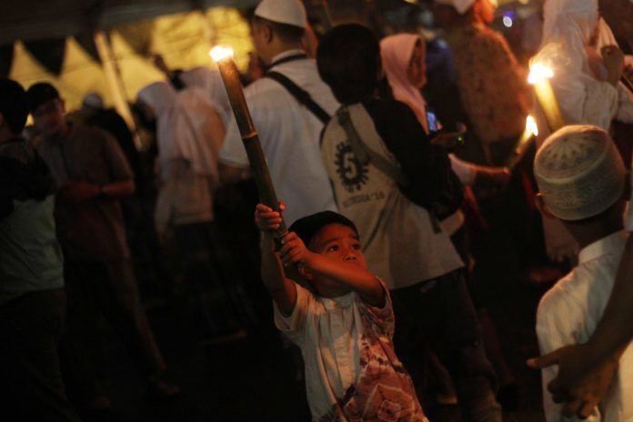 Seorang anak kecil memainkan obor. Pawai kali ini juga banyak diikuti oleh anak-anak yang dibawa oleh orang tua mereka.[/caption][caption id="" align="aligncenter" width="696"]