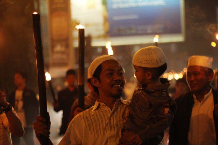 Seorang bapak tampak membawa anaknya yang berseragam polisi cilik dalam gendongan. Sepanjang perjalanan anak tersebut tampak ceria ikut dalam Pawai Obor Ramadan.[/caption][caption id="" align="aligncenter" width="696"]