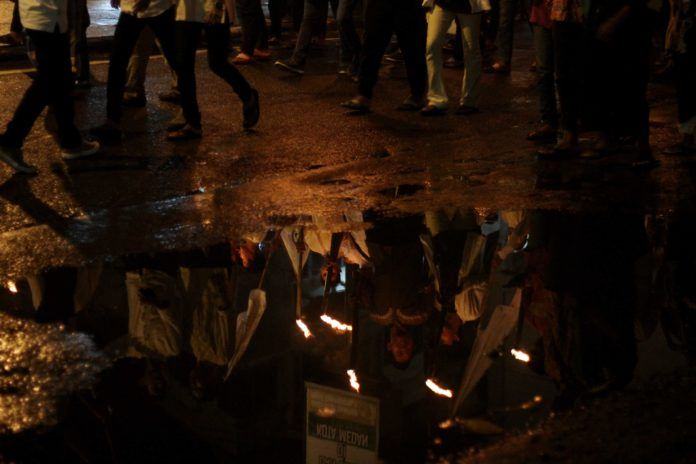 Refleksi massa pawai Obor Ramadan tertangkap kamera dari genangan air di Jalan Sm Raja Medan.[/caption][caption id="" align="aligncenter" width="696"]